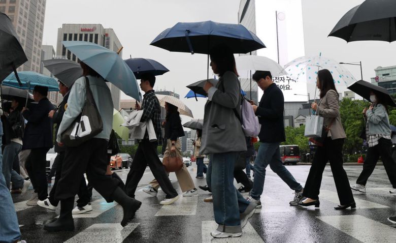 전국 대부분 지역에 비가 내린 9일 오전 서울 광화문네거리에서 우산을 쓴 시민들이 출근하고 있다. 2025.5.9 뉴스1