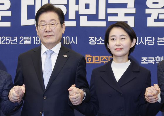 이재명 더불어민주당 대표, 김재연 진보당 상임대표가 지난 2월 19일 서울 여의도 국회에서 열린 '내란종식 민주헌정수호 새로운 대한민국 원탁회의' 출범식에서 손을 맞잡고 기념 촬영하고 있다. 뉴스1 |