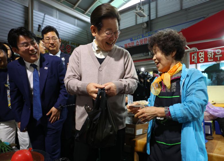 더불어민주당 이재명 대선 후보가 제3차 골목골목 경청투어로 경북지역 방문에 나선 9일 경북 영천시 영천공설시장을 찾아 한 가게에서 영천사랑상품권으로 야채를 구매하고 있다. 연합뉴스 |