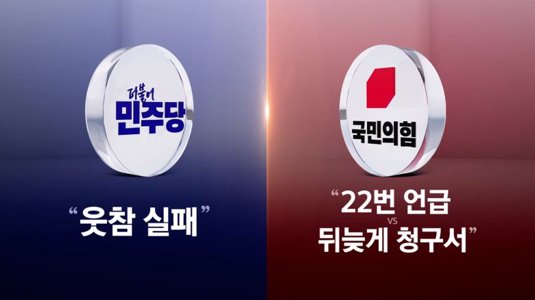 먼저 첫 번째 키워드부터 확인해 볼까요. 더불어민주당은 웃참 실패고요. 국민의힘은 22번 언급 대 뒤늦게 청구서입니다. 먼저 지금 갈등이 아주 뜨거운 국민의힘 상황부터 보죠.