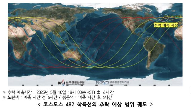 우주청은 궤도 분석 결과(5월 9일 09:00 기준)에 따라 코스모스 482 착륙선은 한국시간 10일 오후 12시~24시 사이에 추락할 가능성이 높을 것으로 예측했다. 또한 천문연 우주감시 장비의 궤도 검증 결과에 따라 추락 예정 오차 범위 전후 6시간을 고려할 때 동 착륙선의 이동 경로는 한반도를 지나지 않을 것으로 분석했다.