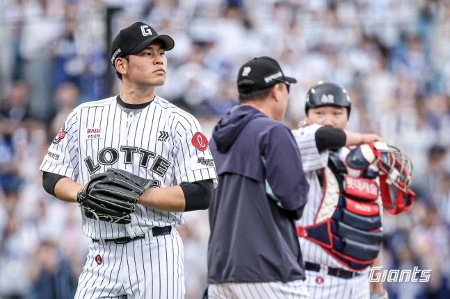 [서울=뉴스핌] 롯데 자이언츠의 선발투수 김진욱이 4월 19일 대구 삼성전에서 7실점 후 강판 당하고 있다. [사진 = 롯데] 2025.04.19 wcn05002@newspim.com |