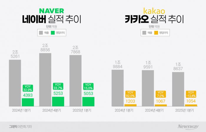국내 양대 플랫폼 네이버와 카카오의 1분기 성적표 희비가 갈렸다. 검색, 커머스 등 전 분야에서 성장세를 보인 네이버와 달리 카카오는 콘텐츠 부문 매출 감소로 실적 부진을 겪고 있다.