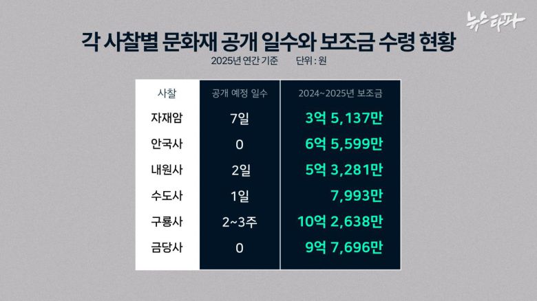 그러나 뉴스타파 취재 결과, 정부는 관람료 감면 보조금 외에 문화유산 관리 및 보존을 위해 별도의 예산을 지원하고 있다. 보조금을 받는 65개 사찰도 예외는 아니다.