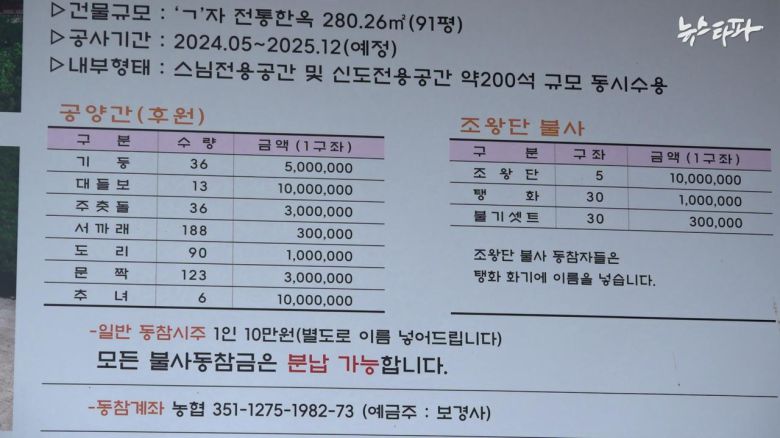 게다가 보경사는 '불사'라는 명목으로 공양간 기둥 1개에 500만 원, 대들보는 각 1,000만 원의 시주를 받고 있다. 공양간 신축을 사실상 수익사업으로 활용한다는 지적이 나온다.