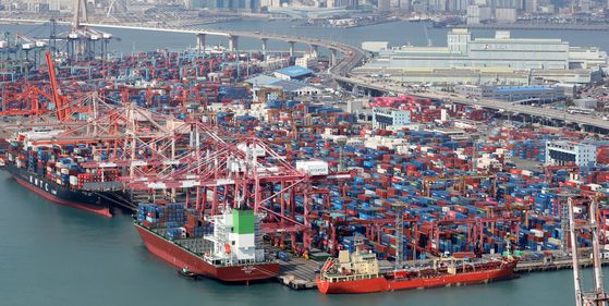 부산항 감만부두 야적장에 컨테이너가 쌓여 있다. 한국은행이 이날 발표한 국제수지 잠정 통계에 따르면 지난 3월 경상수지는 91억4000만 달러 흑자로 집계됐다. 연속 흑자 기록은 23개월로 늘어났다. 뉴스1 |
