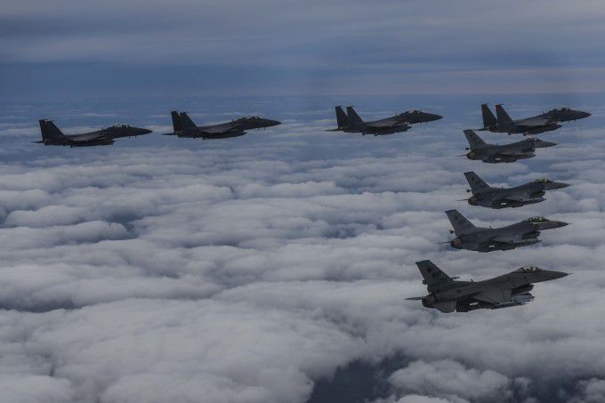 한국 공군 주력 전투기 F-15K 4대와 주한 미 공군 F-16 4대가 지난 10월 4일 북한의 준장거리 탄도미사일(IRBM) 도발에 대응하는 공격 편대군 비행과 정밀폭격 훈련을 위해 대응 출격을 하고 있다.  [사진=합참]