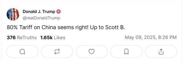 그는 자신의 소셜미디어 트루스소셜 계정에서 "스콧 B에 달렸다"면서 대중 관세 인하 방침을 알렸다. 트럼프 대통령이 지칭한 스콧B는 미 재무장관 스콧 베선트를 뜻한다.