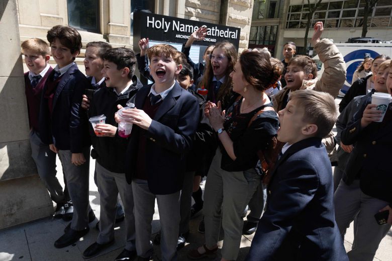미국 일리노이주 시카고 출신의 로버트 프랜시스 프레보스트 추기경이 8일 첫 미국인 교황으로 선출되었다는 소식을 접한 뒤, 시카고의 홀리 네임 대성당 밖에서 학생들이 환호하고 있다./AFP 연합뉴스 |