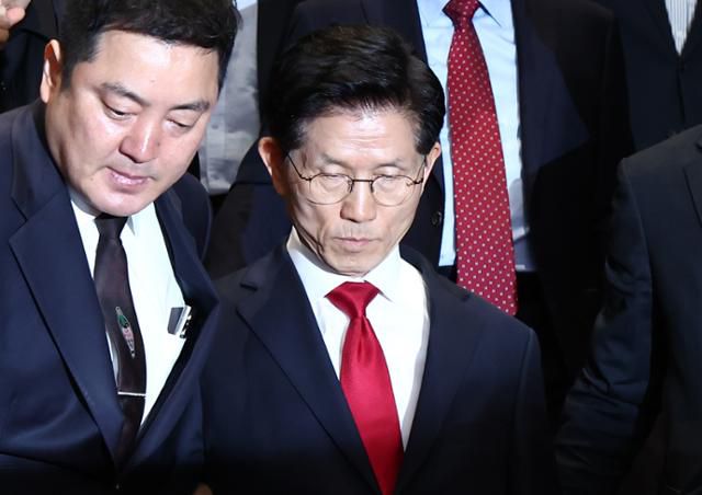 김문수 국민의힘 대선 후보가 9일 국회에서 열린 의원총회에서 굳은 표정으로 나오고 있다. 뉴스1 |
