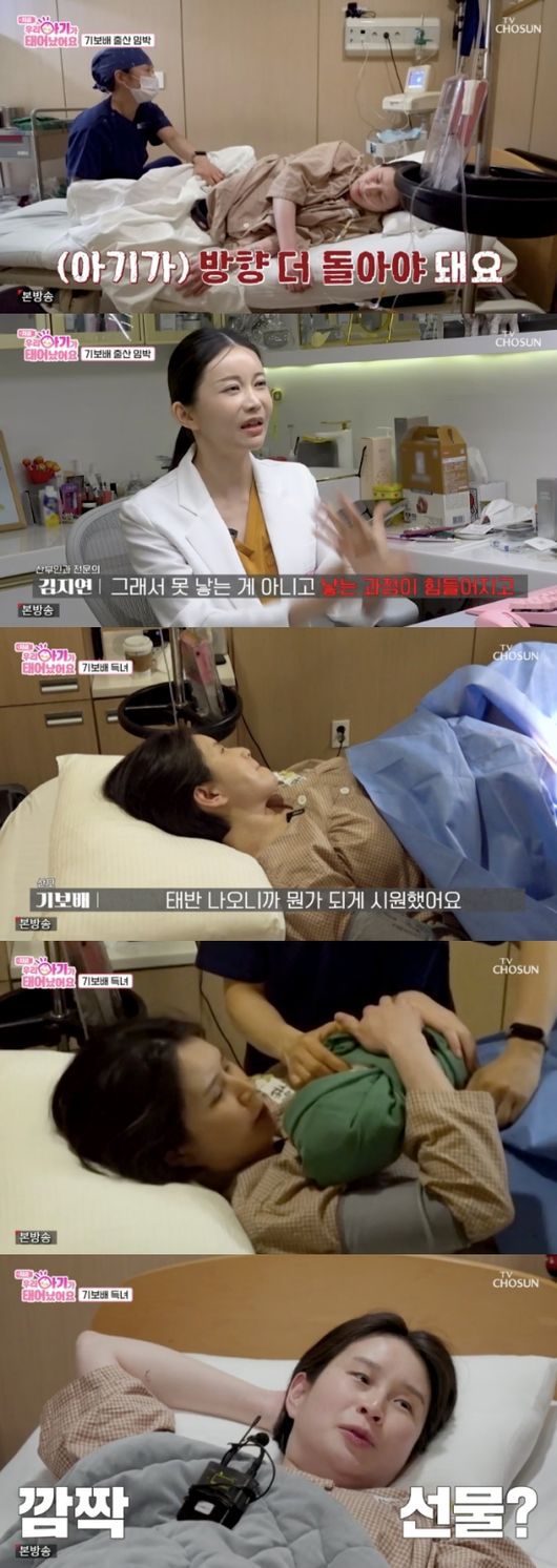 의료진은 출산 기미가 없는 기보배에게 “아기가 끝에 있어서 진통이 거의 안 온다. 촉진제를 쓰겠다”라고 말했다. 이후 의료진은 진통이 약해서 일부러 양수를 터뜨렸다고 말했고 출산 준비에 돌입했다. 의료진은 “아기가 하늘을 보고 있었다. 옆으로 누워 있으면 아기가 돌 것이다. (보호자가) 옆에 있다가 묵직하다고 하면 말해달라”라고 말했다.