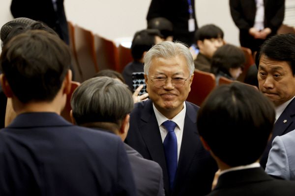 문재인 전 대통령이 4월 25일 서울 여의도 국회도서관에서 열린 4.27 판문점선언 7주년 기념식을 마친 뒤 참석자들과 인사를 나누고 있다. 연합뉴스 |
