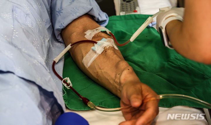 [서울=뉴시스] 김근수 기자 = 서울 강서구의 한 병원에서 신장 투석을 받고 있는 환자. 2024.04.11. ks@newsis.com |