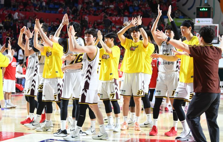 창원 LG의 경기에서 LG 선수들과 팬들이 기뻐하고 있다. KBL 제공 |