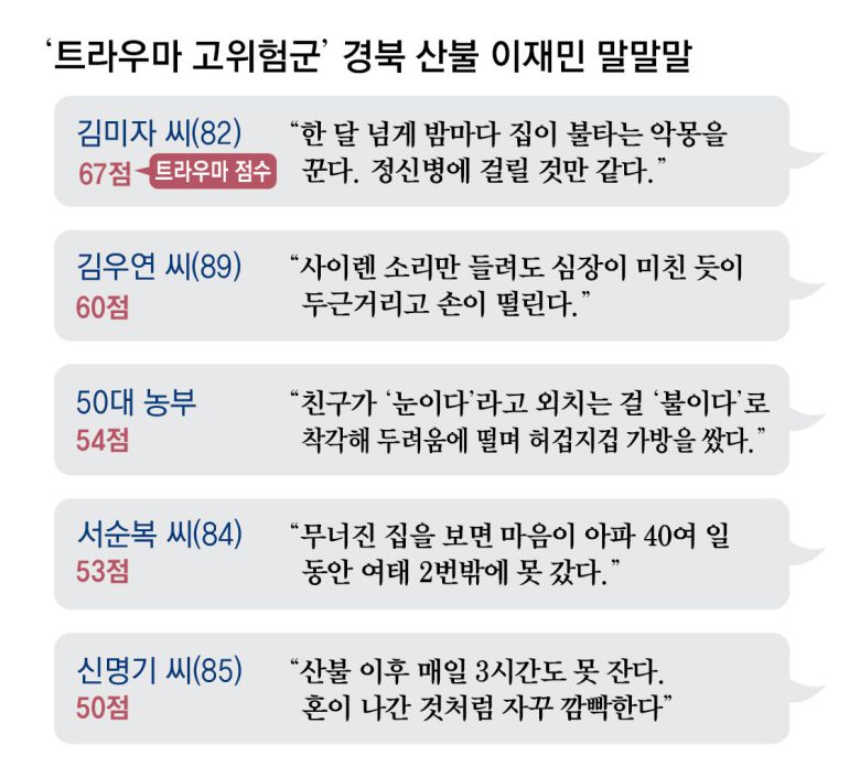 역시 고위험군인 대곡리 주민 김모 씨(87)는 “눈 감으면 5남매 주려고 농사지은 깨, 아끼던 놋그릇 등이 다 타버린 게 떠올라 두 달째 잠을 못 잔다”며 울었다. 영양군 석보면 화매리 주민 50대 여성 A 씨는 이번 산불로 이웃 주민 2명을 잃었다. 그는 친구가 “눈이다”라고 한 말을 “불이다”로 잘못 듣고 공포에 질려 황급히 가방을 싸 대피하려 한 적도 있었다.
