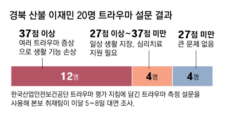 3월 22일 경북 의성에서 시작된 역대 최악의 산불 사태가 이달 11일이면 발생 50일째다. 불은 진화됐고 주요 뉴스에서도 멀어졌지만, 피해를 입은 당사자들은 여전히 극심한 정신적 고통(트라우마)에 시달리며 이전과 달라진 삶을 살고 있었다. 동아일보는 5∼8일 한국산업안전보건공단 트라우마 평가 지침에 따른 설문을 활용해 이재민 20명을 심층 인터뷰했다. 그 결과 20명 중 12명(60%)은 정상적인 생활이 어려워 정신건강의학과 등 병원 치료가 필요할 정도의 트라우마에 시달리고 있는 것으로 나타났다. 정부가 통합심리지원단을 통한 심리 상담을 진행 중이지만 대부분의 이재민은 이 사실을 모른다고 했다. 일상을 회복하기 위해선 물리적인 피해 복구뿐만 아니라 이재민들의 정신, 마음 회복을 위한 대책이 필요하다는 지적이 나온다.