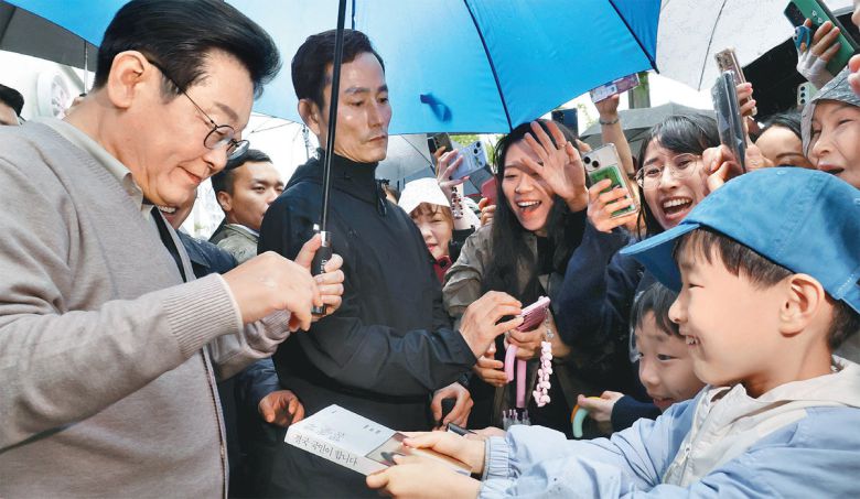 어린이에 저서 사인 요청 받는 李후보 더불어민주당 이재명 대선 후보(왼쪽)가 9일 경북 경주시 용강동 한 아파트단지 인근에서 자신이 저술한 책 ‘결국 국민이 합니다’를 가지고 온 한 어린이에게 사인 요청을 받고 있다. 이 후보는 이날 보수 텃밭으로 불리는 경북 지역을 돌면서 민심을 청취하고 지지를 호소했다. 경주=뉴시스 |