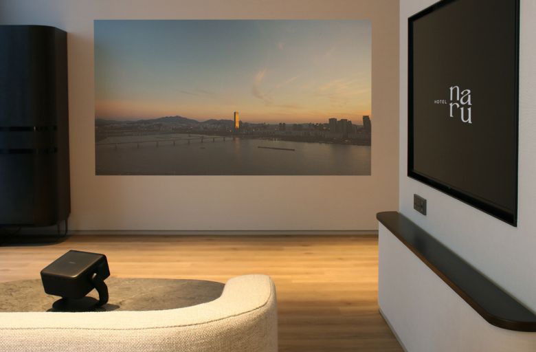 호텔 나루 서울-엠갤러리는 일부 객실에 빔프로젝터를 설치, 시각적 즐거움을 제공함과 동시에 시력이 약한 고객들도 큰 화면으로 콘텐츠를 즐길 수 있도록 배려했다. |
