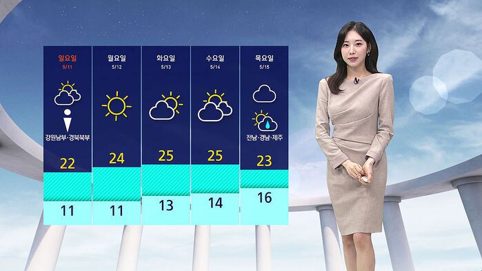 일교차가 크게 벌어지겠고 내일 오후 한때 강원 남부와 경북 북부 지역에는 소나기가 지나겠습니다.