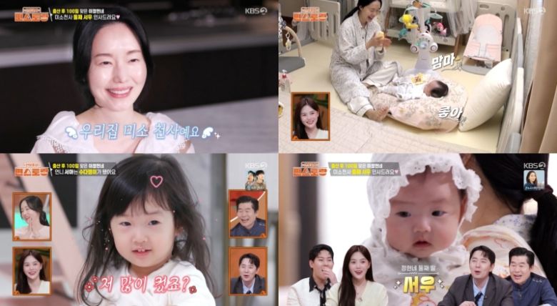 복덩이라는 태명으로 불렸던 이정현 둘째 딸 서우가 방송에 공개되는 것은 이번이 처음. 서우는 눈웃음이 엄마 이정현과 꼭 닮은 귀요미였다. 이정현은 “서우는 아빠를 닮았는데 성격은 나 닮았다. 방긋방긋 잘 웃어서 우리집 미소천사다”라고 말했다. 또 서우는 언니 서아 못지않은 역대급 순둥이였다. 잠에서 깬 뒤 칭얼대지 않고 혼자서 잘 노던 서우는 엄마의 얼굴을 보자 방긋 웃었다.