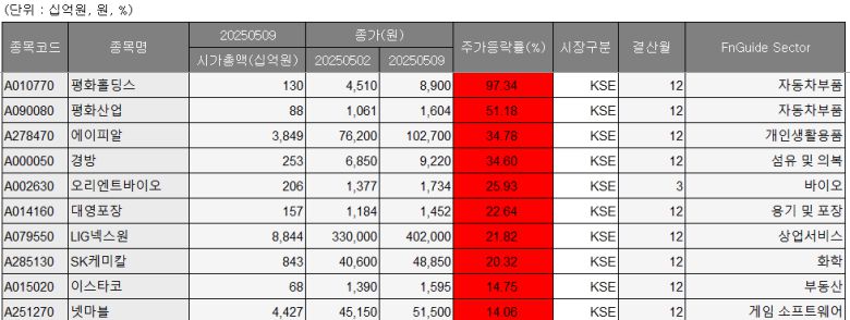 그 외 경방(34.60%), 오리엔트바이오(25.93%), 대영포장(22.64%), LIG넥스원(21.82%) 등이 오름세를 기록했다.
