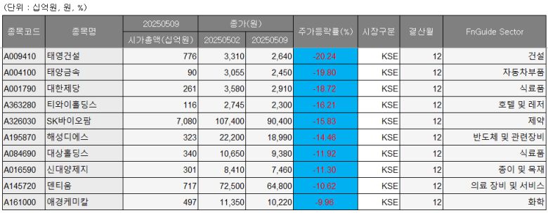 그 외 티와이홀딩스(-16.21%), SK바이오팜(-15.83%), 대상홀딩스(-11.92%), 신대양제지(-11.30%) 등이 약세를 나타냈다.