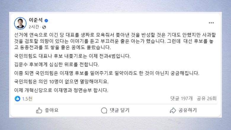이 후보는 SNS에 선거에 연속으로 이긴 당 대표를 생짜로 모욕줘 쫓아낸 것을 반성하는 건 기대도 하지 않았지만, 사과를 검토할 의향이 있다는 이야기를 듣고 부끄러운 줄은 아는가 했다고 적었습니다.