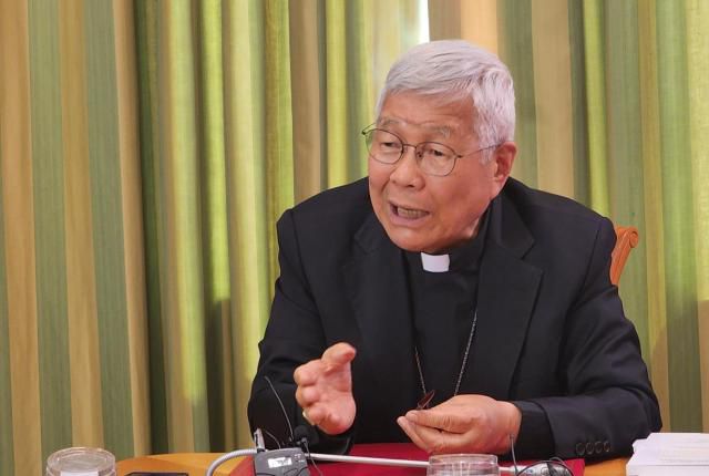 교황청 성직자부 장관인 유흥식 추기경이 9일(현지시간) 교황청 성직자부 청사에서 한국 취재진과 간담회를 하고 있다. [연합뉴스]