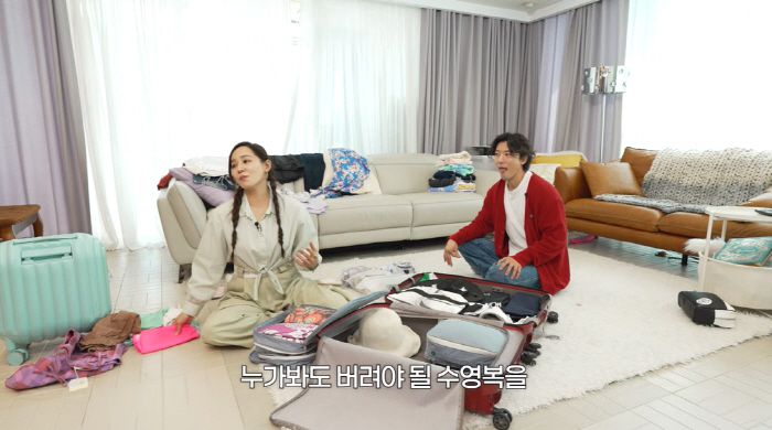 그런가 하면 캐리어에 챙긴 것들 중 가장 눈에 띈 건 수영복이었다. 유진은 두 딸의 수영복을 샀다며 자랑했는데 화사한 디자인으로 눈길을 끌었다. 반면 기태영은 "난 수영복을 10년 넘게 입었다"라고 말했고 유진은 "하얀 게 다 누레져서 누가 봐도 버려야 될 수영복이었다. 근데 좋다고 계속 입더라"라고 말해 웃음을 안겼다. 기태영은 "마음에 드는게 있을 때까지 안산 건데, 이번에 원 플러스 원 상품으로 새 수영복을 장만했다"라고 말했다.