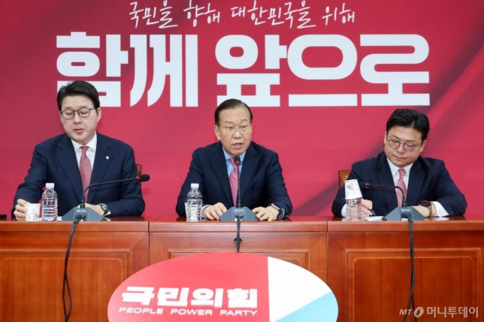 권영세 국민의힘 비상대책위원장이 10일 서울 여의도 국회에서 김문수 대통령 후보 자격 취소·한덕수 전 총리 입당 및 대선후보 등록 과정에 대해 기자회견을 하고 있다. 왼쪽부터 신동욱 수석대변인, 권 비대위원장, 강명구 의원. 2025.5.10/사진=뉴스1 /사진=(서울=뉴스1) 안은나 기자
