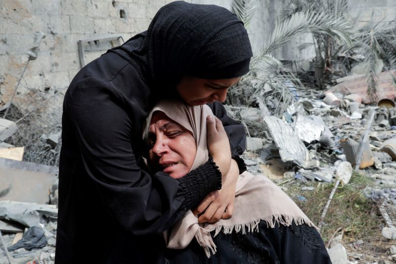 팔레스타인 땅 가자지구 남단 칸유니스에서 이스라엘군 폭격으로 갓 결혼한 아들을 잃은 어머니가 애통에 빠져 있다. REUTERS 연합뉴스