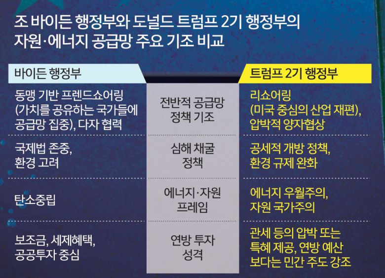 트럼프 대통령은 취임 후 3개월여 동안 미국 에너지·자원 개발과 관련한 여러 개의 상징적인 정책을 발표했다. 심해 채굴 촉진 행정명령 발표, 전국 10개 광산 프로젝트에 대한 인허가 신속 처리 방침 발표 등이다. 여기에 알래스카 LNG 개발 프로젝트에 동맹국 참여 압박, 우크라이나와의 광물협정 체결 등은 트럼프식 미국 우선주의 공급망 정책이 각 동맹국들에 미치는 영향을 상징적으로 보여준다. 목표는 중국을 공급망에서 제외시키는 것이다.