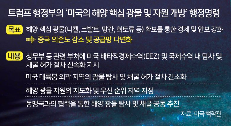 트럼프 대통령은 지난달 24일(현지시간) “지금까지 심해는 방치된 자산이었다”며 ‘미국의 해양 핵심 광물 및 자원 개방’ 행정명령을 발표했다. 이 명령은 미국의 배타적경제수역(EEZ)뿐만 아니라 국제수역에서도 심해 자원의 탐사 및 채굴을 촉진하도록 상무부와 기타 관계 부처에 지시하고 있다. 특히 국제수역에서의 탐사 및 상업적 채굴 허가는 국가해양대기청(NOAA)이 신속 처리하도록 지시했다. 미국은 유엔해양법협약(UNCLOS)을 비준하지 않아 국제해저기구(ISA) 회원국이 아니다. 그간 미국 기업은 캐나다, 태평양 섬나라 법인들과의 파트너십 등을 활용해 간접적으로 ISA 탐사권을 얻었다. 하지만 이번 행정명령은 ISA 승인 없이도 국제수역에서 자원을 빠르게 확보할 수 있는 길을 열었다.