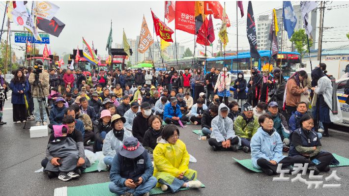 10일 '트랙터 상경 시위'를 위해 서울 금천구 석수역 일대에 도착한 전국농민회총연맹이 서울에 진입하지 못한 채 차량에서 내려 집회를 진행하고 있다. 송선교 기자
