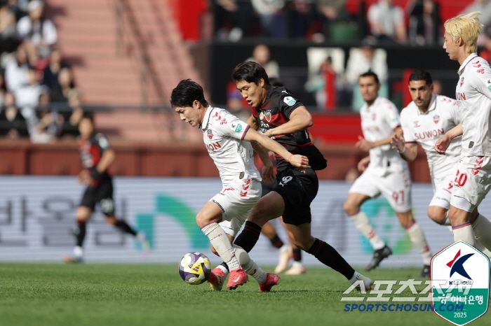 수원도 만회골을 위해 분투했다. 후반 5분 수원의 프리킥 찬스에서 이지솔의 헤더가 크로스바를 강타했다. 후반 11분 안데르손의 킬패스에 이은 루안의 슈팅이 한현서의 태클에 걸려 불발됐다. 후반 13분 박스 안으로 파고든 조르지의 패스를 이어받은 이태석의 슈팅이 높이 떴다. 후반 15분 수원은 많이 뛴 이택근, 루안 대신 박용희, 김재성을 투입하며 변화를 꾀했다. 후반 16분 이재원의 패스를 이어받은 싸박의 슈팅도 하늘로 솟구쳤다. 후반 16분 많이 뛴 포항 이태석도 오른쪽 허벅지를 매만지며 주저앉았다. 박태하 감독은 후반 18분 이태석, 김인성 대신 아스프로, 강민준을 투입했다. 5백을 가동하며 승리를 지킬 뜻을 분명히 했다.