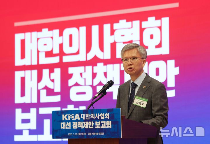 [서울=뉴시스] 김선웅 기자 = 김택우 대한의사협회장이 10일 서울 용산구 대한의사협회에서 열린 제21대 대통령 선거 보건의료 분야 정책제안 보고회에서 개회사를 하고 있다. 2025.05.10. mangusta@newsis.com