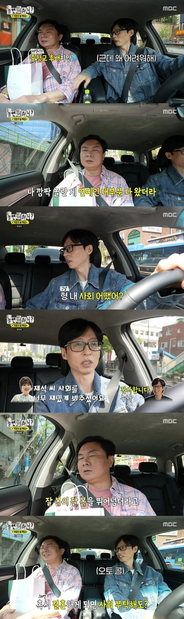 이어 유재석은 김종민 결혼식을 언급하며 "그때 만났었잖아. 종민이 결혼식에 많이 왔었지. 내 사회 어땠어?"라고 물었다. 임원희는 "최고지"라고 답했다.
