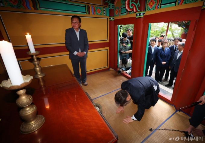 [남해=뉴시스] 조성우 기자 = 민심을 청취하는 '경청 투어'에 나선 이재명 더불어민주당 대선후보가 10일 경남 남해군 충렬사 이순신 장군 사당을 참배하고 있다. (공동취재) 2025.05.10. photo@newsis.com /사진=