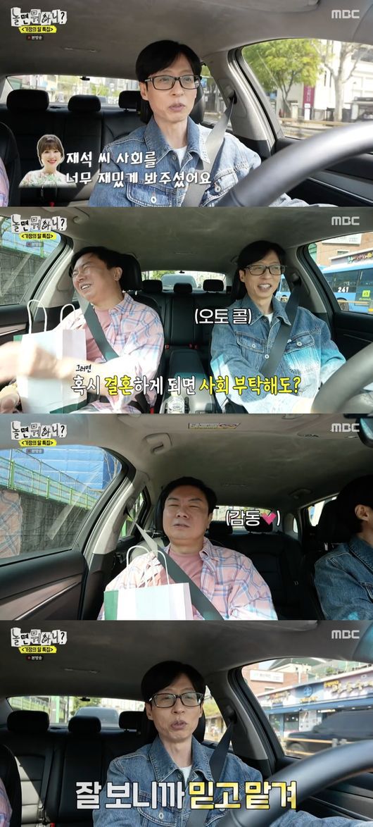 그런가 하면 유재석은 "형 우리 종민이 결혼식 때도 만났잖아"라며 "내 사회 어땠냐"라고 물었다. 유재석은 "하희라 선배님도 '재석 씨 사회를 너무 재미있게 잘 봐주셨다'라고 칭찬해주셨다"라고 자부심을 느꼈다.