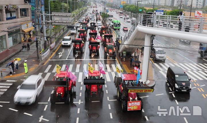 [서울=뉴시스] 이영환 기자 = 10일 오후 서울 금천구 지하철 1호선 석수역 인근에서 전국농민회총연맹(전농) 산하 전봉준투쟁단이 광화문 동십자각에서 진행되는 내란농정 청산 농업대개혁 실현 5.10 범시민대회에 참석하기 위해 트랙터 상경 시위를 이동하고 있다. 2025.05.10. 20hwan@newsis.com