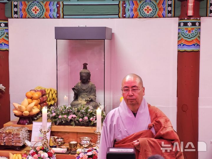 [서산=뉴시스] 김덕진 기자=충남 서산 부석사 원우 주지스님이 10일 부석사 설법전에서 금동관세음보살좌상 일본 반환 관련 언론 인터뷰를 하고 있다. 2025.05.10. spark@newsis.com