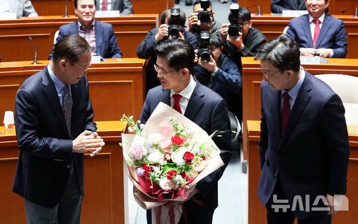 [서울=뉴시스] 권창회 기자 = 김문수 국민의힘 대선 후보가 9일 오전 서울 여의도 국회에서 열린 의원총회에서 권영세 비상대책위원장과 권성동 원내대표에게 꽃다발을 받고 자리로 이동하고 있다. 2025.05.09. kch0523@newsis.com |