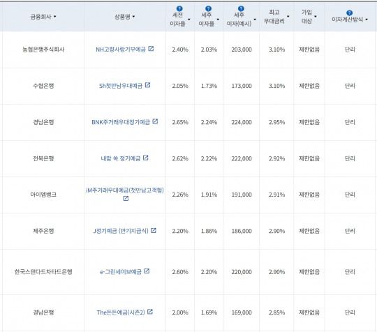 11일 금융감독원 금융상품통합비교공시에 따르면 은행 12개월 정기예금 가운데 최고 우대금리를 제공하는 상품은 농협은행의 ‘NH고향사랑기부예금’이다. 이 상품은 세전이자율 2.40%에 우대금리를 더해 최고 3.10%의 금리가 제공된다. 우대 조건은 ▲고향사랑기부금 납부고객 0.5%p ▲만 65세 이상 고령자 0.1%p ▲만 19~34세 MZ고객 0.1%p ▲고향사랑 특별금리 0.1%p 등이다. 고향사랑기부금 우대금리는 농협은행·농축협 영업점 또는 고향사랑e음 홈페이지를 통한 기부금 납부 실적이 확인되는 경우 적용된다.