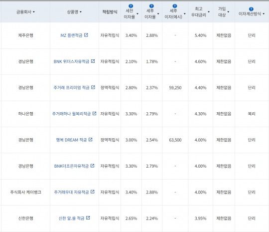 11일 금융감독원 금융상품통합비교공시에 따르면 제주은행 ‘MZ 플랜적금’이 최고 우대금리 5.40%를 제공해 가장 높은 금리를 제공하고 있다. 이 상품의 세전이자율은 3.40%이며 ▲매월 1회 이상 지속적 납입 시(1년제) 0.50%p ▲목표 금액 달성 시 0.50%p ▲신용·체크카드 합산 사용액 월 10만원 이상 사용 시 0.50%p ▲‘청년이니까응원합니다’ 이벤트 참여 시 0.50%p가 우대금리로 제공된다. 월 납입한도는 30만원 이하다.