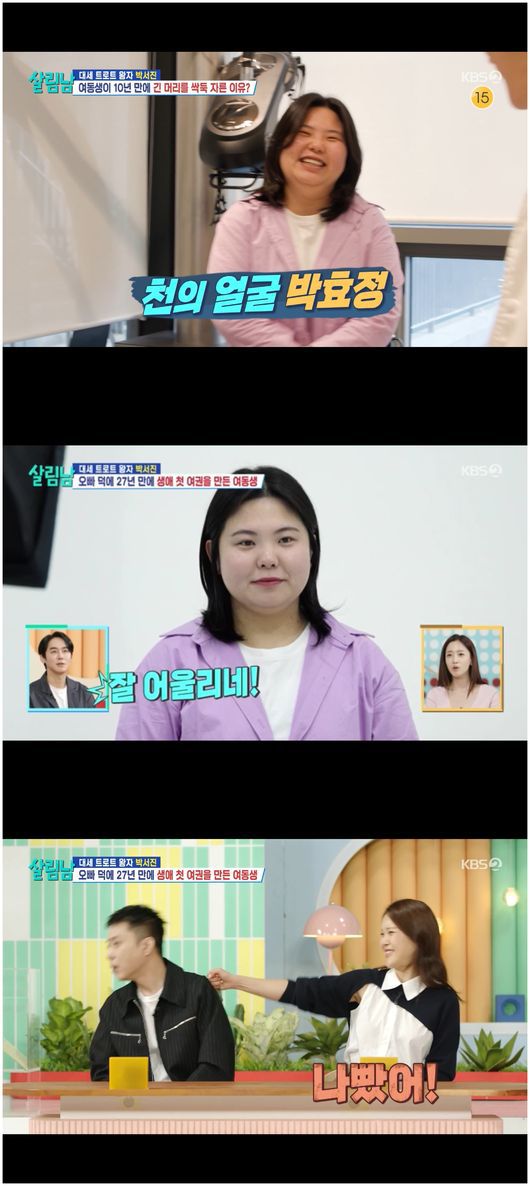 이에 박서진은 “근데 긴 머리카락이 나은 것 같기도. 약간 남자가 단발한 것 같다. 나 이런 아저씨 봤는데. 너 정형돈 같다. 웨이러미닛, 그 머리카락 아냐”라며 놀렸고, 박효정은 “긴 머리를 잃고 정형돈이 된 거 같다. 정형돈 됐네. 짜증나네”라며 오빠가 민망하지 않게 받아주어 훈훈함을 더했다.