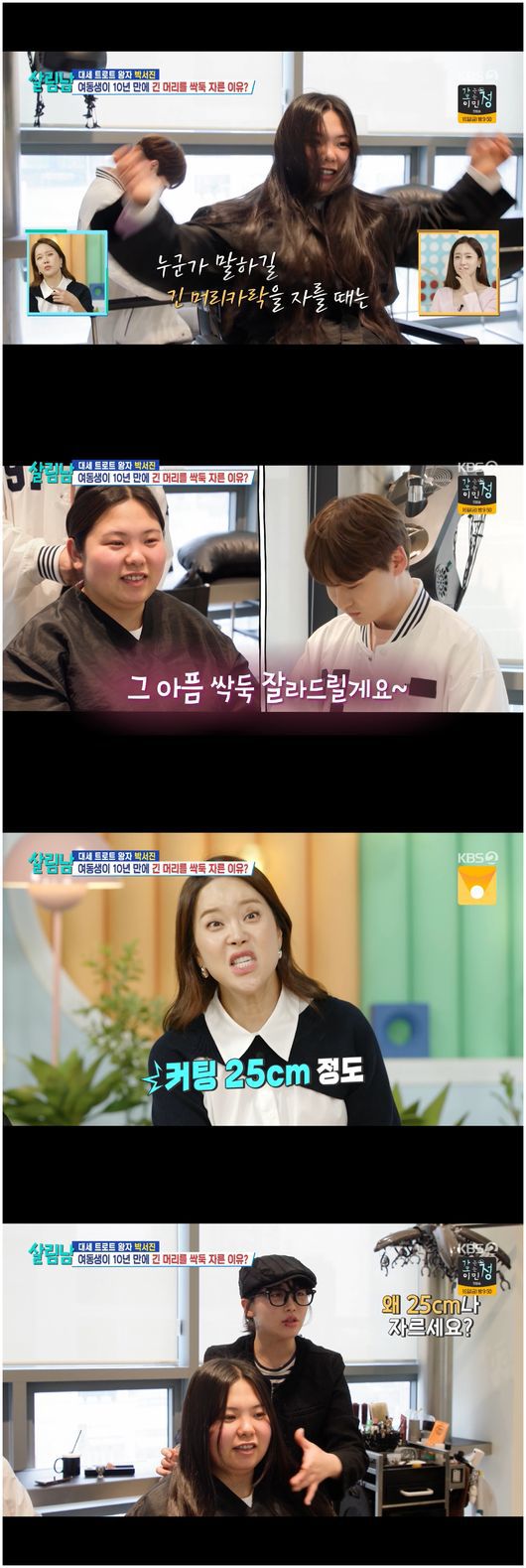 10년 기른 머리카락을 싹둑 자르기로 결심한 박효정. 박효정은 “25cm 정도 자르려고 한다. 머리카락 기부를 하려고 한다. 오빠도 얼마 전에 산불 기부 1억 원을 했다. 저도 좋은 마음으로 동참하고자 한다”라고 말해 모두를 감탄하게 만들었다.