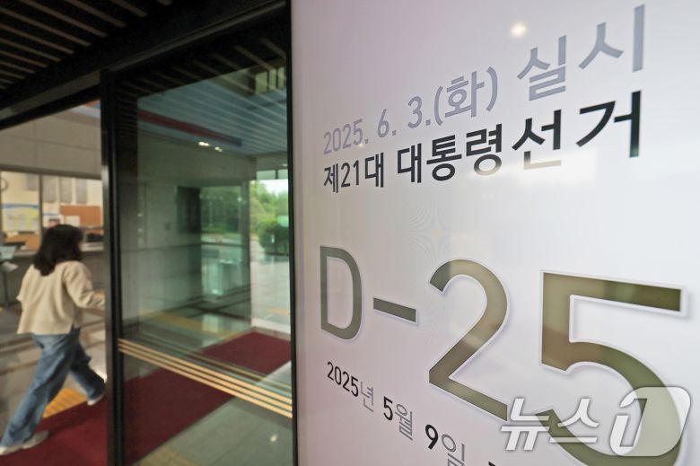 9일 경기 과천시 중앙선거관리위원회 로비에 설치된 화면에 제21대 대통령선거까지 D-25일이 표시되고 있다. 2025.5.9/뉴스1 ⓒ News1 장수영 기자 |