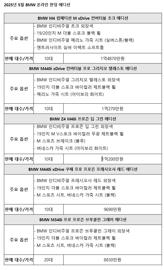 BMW코리아 관계자는 이번 한정판 모델들에 대해 “봄바람을 느끼며 오픈 에어링과 역동적인 성능을 즐길 수 있는 고성능 컨버터블 모델 3종, 짜릿한 주행감을 선사하는 고성능 쿠페 및 세단 모델 각 1종 등 총 5종의 한정 에디션을 선보인다”고 밝혔다.