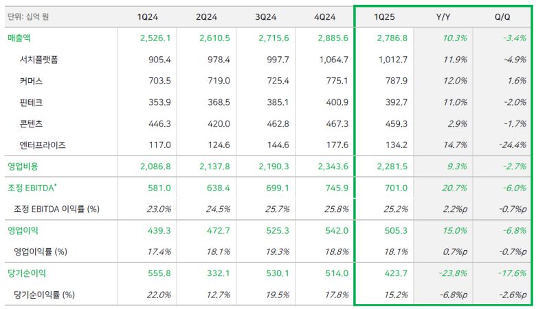 1분기 연결 매출은 서치플랫폼과 커머스 등 주요 사업 부문의 견조한 성장에 힘입어 전년 동기 대비 10.3% 증가한 2조 7868억 원을 기록했다. 조정 EBITDA는 전년 동기 대비 20.7% 늘어난 7010억 원이며, 연결 영업이익은 15.0% 증가한 5053억 원으로 집계됐다. 이에 따라 영업이익률은 18.1%를 기록했다.