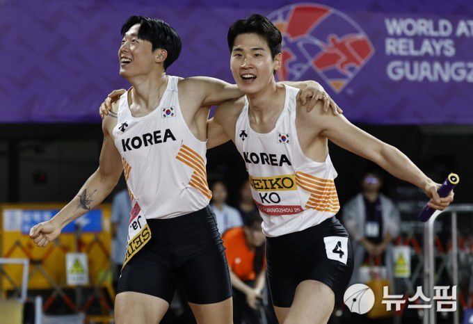 [광저우 로이터 =뉴스핌] 박상욱 기자 = 한국 육상 남자 400m 계주팀 앵커 고승환(오른쪽)이 10일 중국 광저우에서 열린 2025 세계육상릴레이선수권 400m계주에서 38초56에 결승선을 통과한 뒤 동료 이재성과 함께 기뻐하고 있다. 2025.5.10 psoq1337@newspim.com